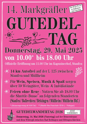 Am Gutedel Tag dreht sich alles um die traditionsreiche Rebsorte, die das Markgräflerland so besonders macht. Wir sind mit einem Stand direkt am Kreisverkehr in Ballrechten-Dottingen vertreten und freuen uns darauf, Ihnen unsere aktuellen Gutedel-Weine zu präsentieren. Probieren Sie verschiedene Weine und entdecken Sie die feinen Unterschiede, die unser Terroir und unsere sorgfältige Arbeit im Weinberg hervorbringen.