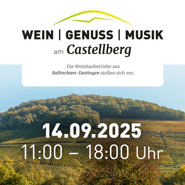 Wein-Musik-Genuss am Castellberg am Sonntag, 14. September 2025 von 11.00 bis 18.00 Uhr Im herbstlich, von der Natur geschmückten Weinberg erleben Sie, wo die Weine vom Castellberg heranwachsen. Lernen Sie die Menschen kennen, die hinter diesen Weinen stehen und Ihnen die unverwechselbare Handschrift und Vielfalt verleihen: die Winzer vom Castellberg.